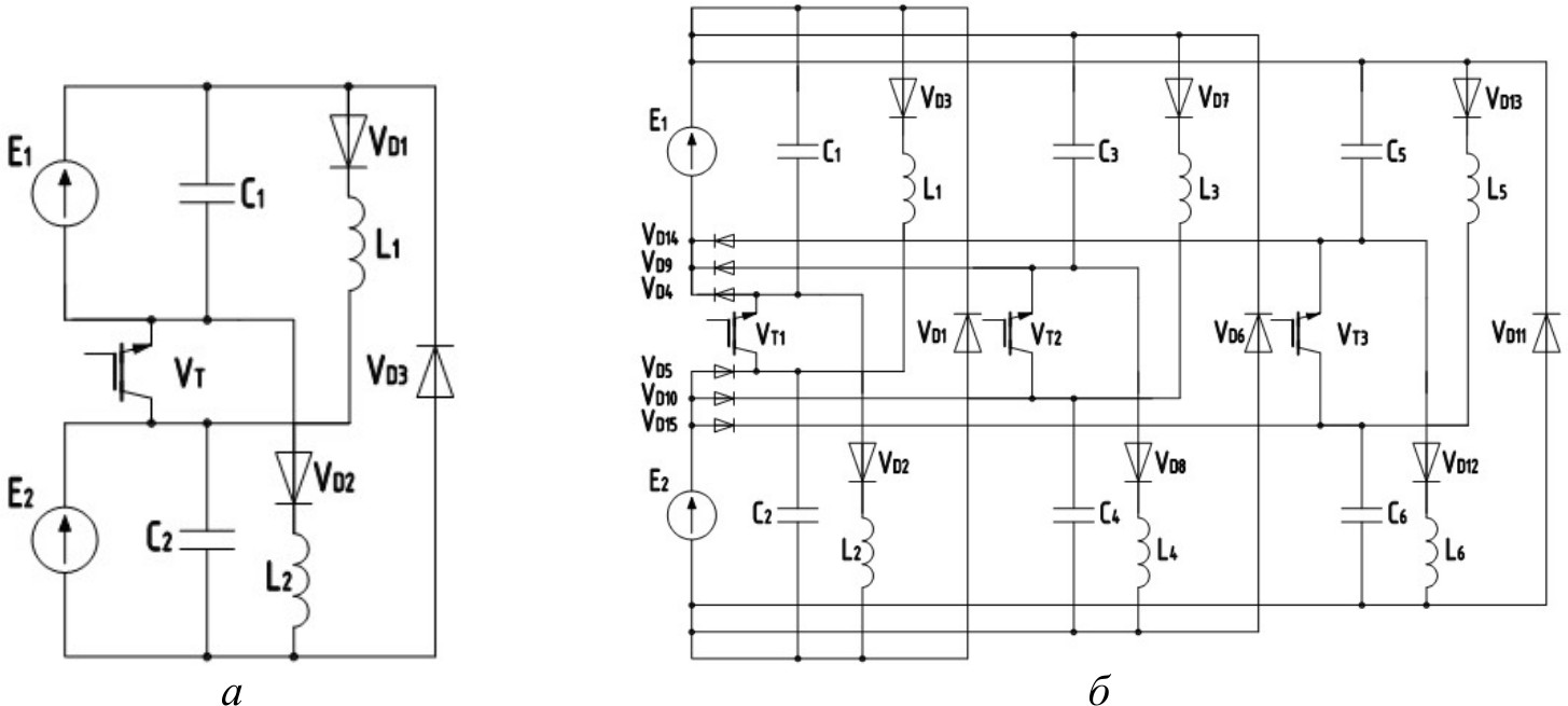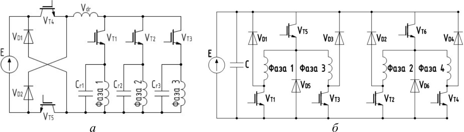 Рис. 3. Схемы преобразователей с (q + 2) ключами на q фаз и 1.5q ключами на q фаз: а – схема резонансного преобразователя с (q + 2) ключами на q фаз в 3‑фазном исполнении; б – схема преобразователя с 1.5q ключами на q фаз и независимым контролем тока фазы в 4-фазном исполнении