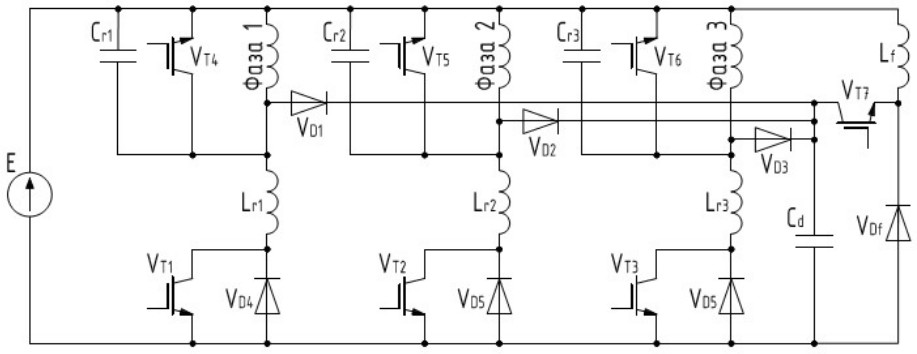 Квазирезонансный преобразователь (рис. 5). Схема работает следующим образом. При открытии ключа VT1 ток начинает протекать через фазу 1 по цепи источник Е – фаза 1 – индуктор Lr1 – ключ VT1 – источник Е. Когда ключ VT1 закрывается, вспомогательный ключ VT4 открывается для обеспечения режима нулевого контура (фаза 1 – ключ VT4 – фаза 1) [17]. Во время отключения фазы вспомогательный ключ VT4 не открывается, а энергия, накопленная на фазе 1, частично сбрасывается в конденсатор Cd через диод VD1 по цепи фаза 1 – диод VD1 – конденсатор Сd – диод VDf – индуктор Lf – фаза 1. Энергия, запасенная в конденсаторе, заряжает источник Е по цепи конденсатор Сd – ключ VT7 – индуктор Lf – источник Е – конденсатор Сd после открытия ключа VT7. Оставшаяся энергия фазы 1 (равная напряжению источника Е) гасится на элементах резонансного переключателя, схема которого обеспечивает коммутацию ключей при нулевом токе.
