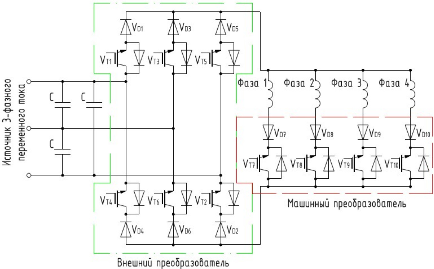 Первая ступень [18] – внешний преобразователь – управляемый выпрямительный / инверторный двухквадрантный преобразователь трансформирует входной трехфазный переменный ток с частотой 50 Гц в однофазный переменный различной частоты. Вторая ступень – машинный преобразователь – коммутирующая ступень, питающая непосредственно обмотки ВИМ. По сравнению с внешним преобразователем частота переключения машинного преобразователя очень низкая, поскольку используется только для коммутации фаз. Максимальные токи и напряжения обоих преобразователей равны.