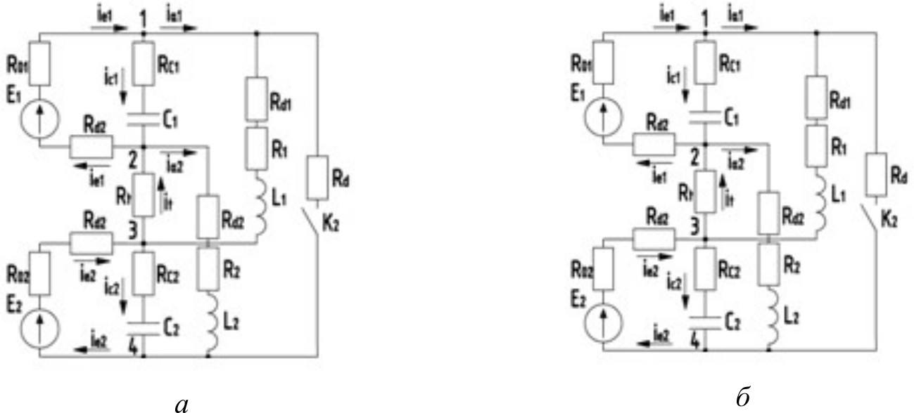 Аналогично для режима закрытия транзистора. С помощью 1-го закона Кирхгофа составляем уравнения для узлов 1–6 (рис. 8, б), с помощью 2-го закона Кирхгофа – уравнения для контуров Е1 – R01 – Rc1 – C1 – Rd2 – E1; L1 – Rс2 – C2 – Rd – Rd1 – R1 – L1; Е2 – R02 – Rd2 – Rc2 – C2 – E2; L2 – Rd – Rc1 – C1 – Rd2 – R2 – L2. После преобразований получаем систему уравнений: