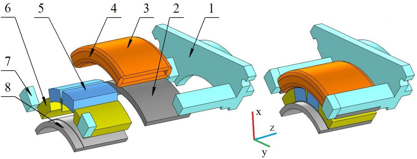 Рис. 1. Геометрическая модель моментного двигателя: 1 – корпус; 2 – магнитопровод статора; 3 – катушка статора; 4 – лобовая часть катушки статора; 5 – постоянные магниты; 6 – фиксирующий состав; 7 – упор; 8 – магнитопровод ротора