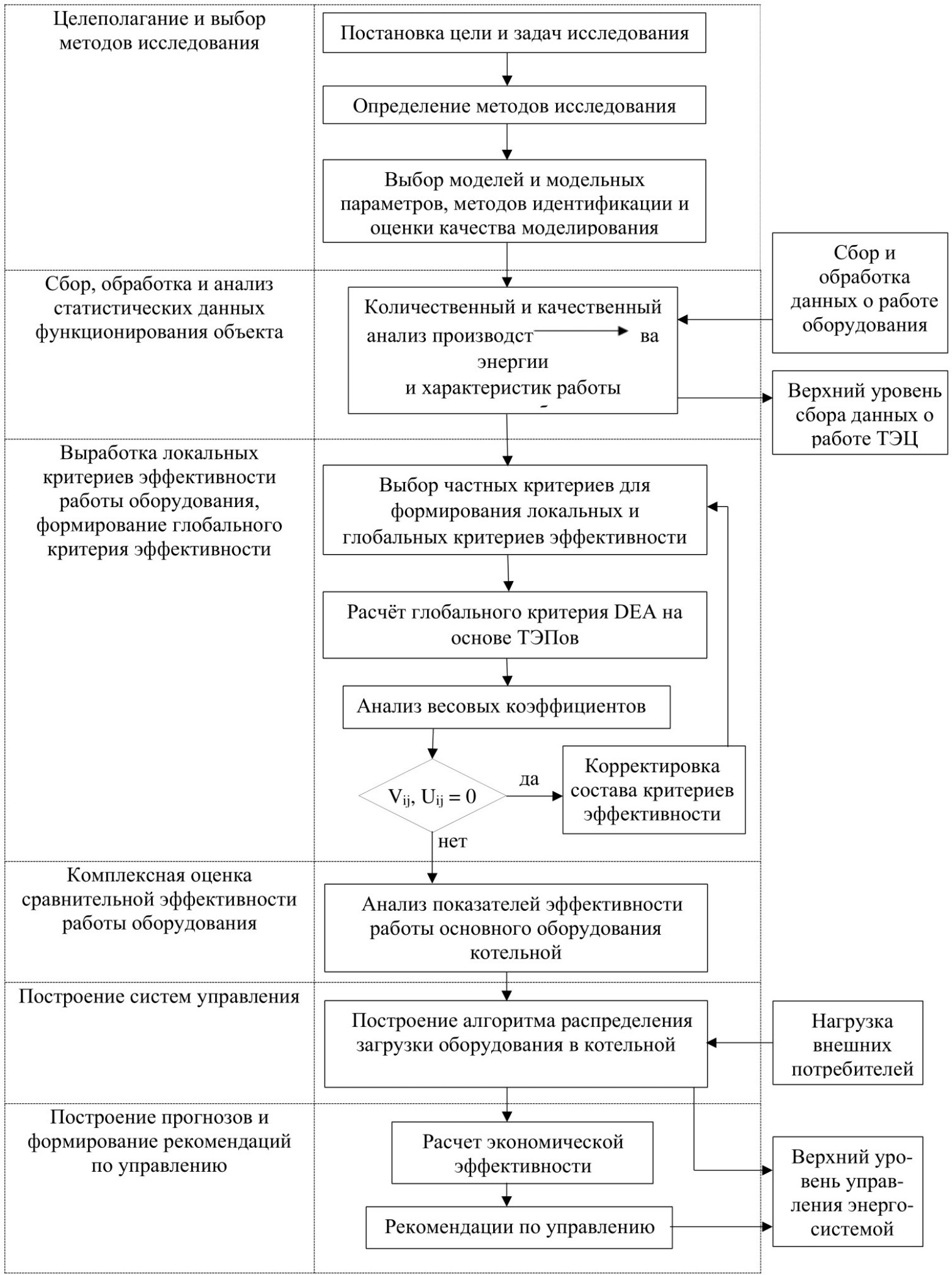 На первом этапе алгоритма производится постановка цели исследования, осуществляется выбор методов исследования и основных параметров, характеризующих работу котельного оборудования, проводится структурный анализ энергетического предприятия.