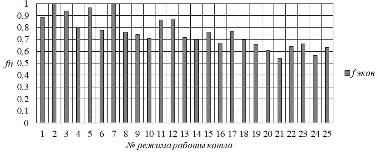 Наибольший вклад относительно других характеристик работы теплового оборудования оказывает удельный расход газа. Вторым по значимости и влиянию на глобальный критерий является показатель, определяющий удельный расход электроэнергии на тягу и дутье. Таким образом, расчеты показали возможность эксплуатации исследуемого котла на всем диапазоне режимов работы, наиболее эффективными являются режимы работы № 1–9, 16–25, где значения глобального критерия достигают максимальных значений, близких к 1.