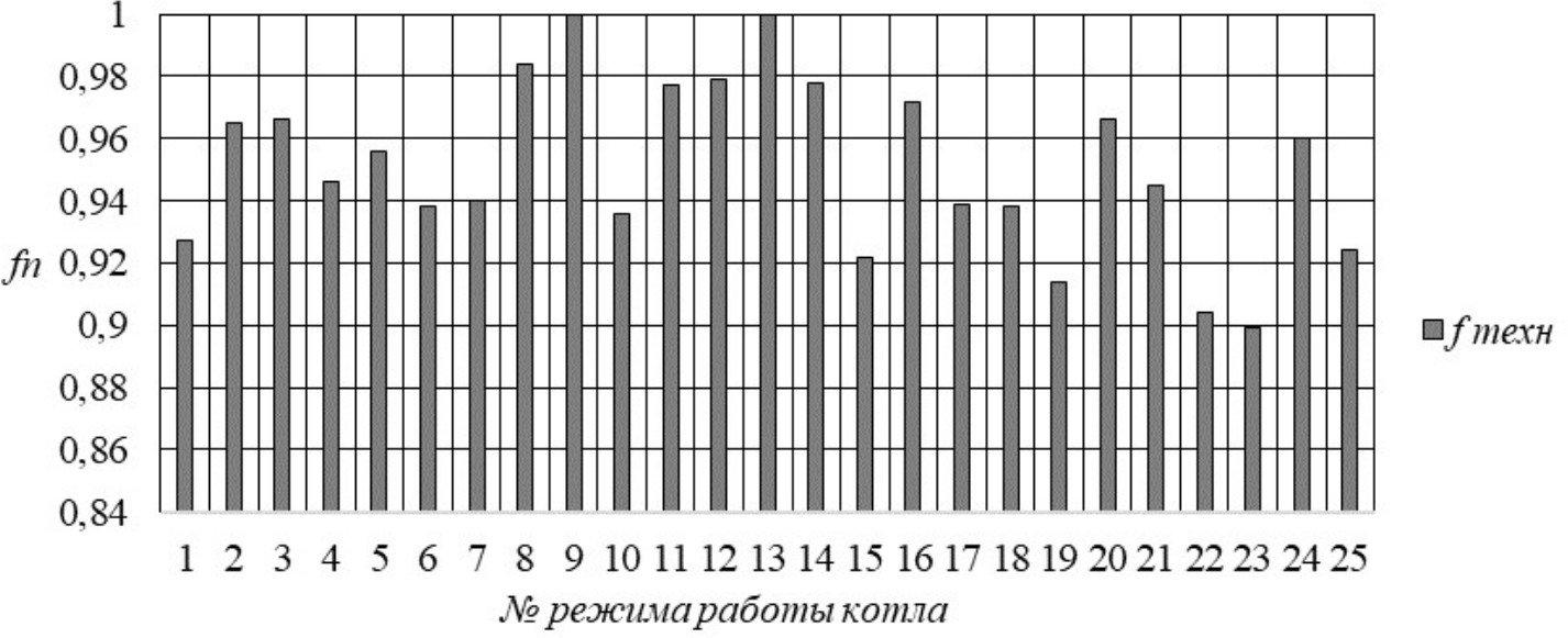 Максимальное значение критерия технологичности наблюдается при режимах работы № 9 и № 13 как следствие минимального значения параметров: температуры уходящих газов и отклонения от оптимального значения разрежения в топке котла. Значительное снижение температуры уходящих газов может свидетельствовать о плохой герметичности котла и повышенных присосах, а рост разряжения в топке – о неудовлетворительной работе устройств, регулирующих работу дымососов.