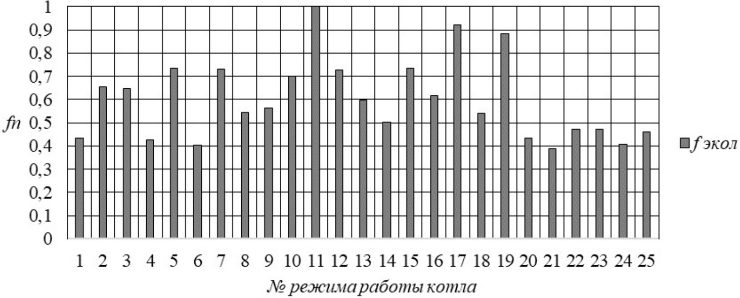 Оптимальными по критерию экологичности являются режимы работы № 5, 7, 10–12, 15, 17, 19, имеющие значения показателя критерия экологичности в интервале .