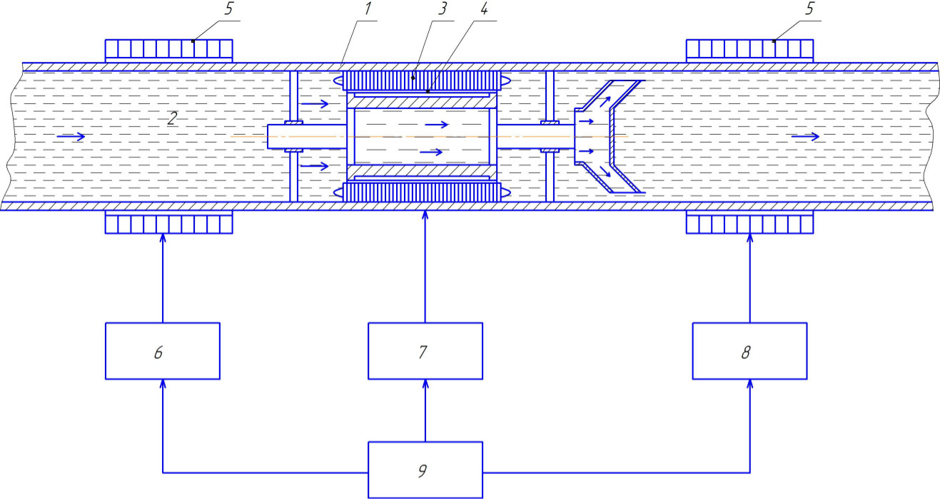 Рис. 1. Схема нагревательного модуля: 1 – трубопровод; 2 – нагреваемая жидкость; 3 – статор трехфазного индуктора; 4 – ротор; 5 – однофазные индукторы; 6, 7, 8 – регулируемые источники питания; 9 – система управления нагревом