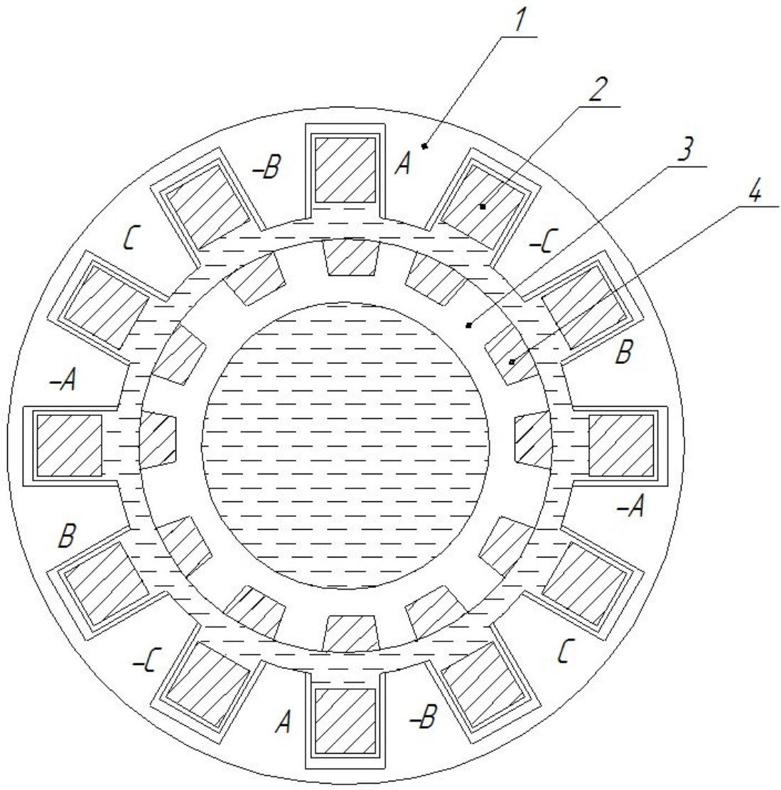 Рис. 2. Трехфазный индуктор с магнитопроводом: 1 – магнитопровод; 2 – обмотка статора; 3 – ротор; 4 – обмотка ротора