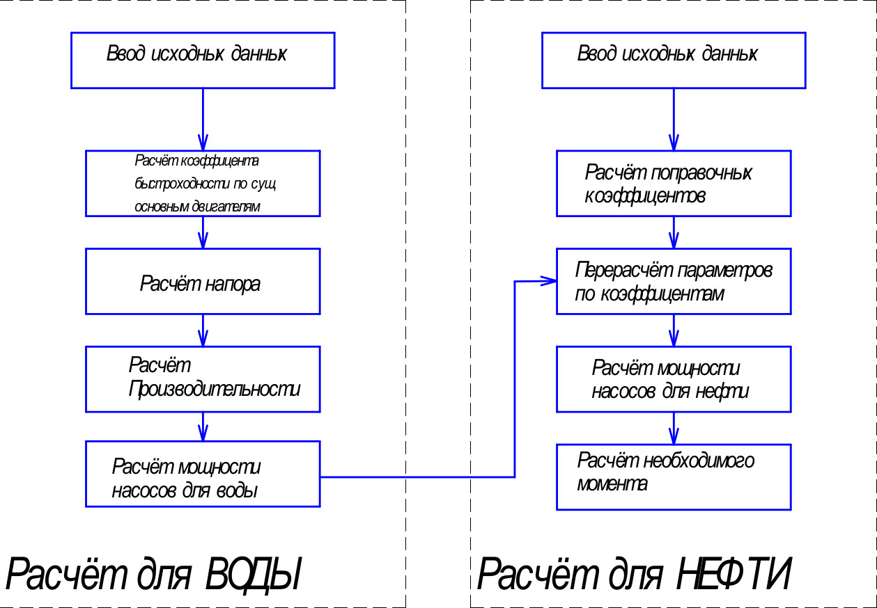 Еще одна проблема заключается в согласовании электромеханических характеристик трехфазного индуктора с характеристиками смесителя. Сложность состоит в отсутствии методики расчета момента вращения осевой крыльчатки в вязких средах. Необходимый для перемешивания нефти момент вращения рассчитывается по методике, предложенной в работе [23, 24]. Методика расчета основана на использовании коэффициентов приведения, устанавливающих связь между моментом вращения в воде и моментом вращения в вязкой среде. Алгоритм расчета представлен на рис. 5. На первом этапе выполняется расчет по методике, в которой в качестве рабочей жидкости рассматривается вода. Затем с использованием коэффициентов приведения производится пересчет мощности и момента для вязкой жидкости с учетом ее реальных характеристик.