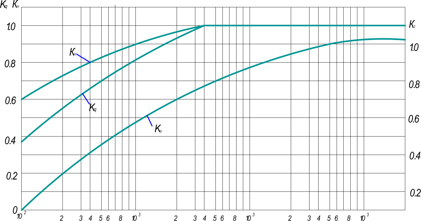 Дальнейший расчет выполняется с помощью опытных поправочных коэффициентов , которые при найденных числах Рейнольдса находятся из графика [23, 24] (рис. 6).
