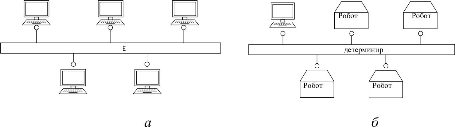 При создании сети или проектировании системы, использующей сеть, сеть должна быть выбрана в соответствии с требованиями к ней. Однако во многих случаях требуется наличие сети Ethernet, поскольку она используется для соединения компьютеров. Другие компоненты, например оборудование на заводе, могут иметь более строгие требования, и это означает необходимость в двух сетях. Как показано на рис. 1а, сеть содержит только ПК и является однородной. Сеть на рис. 1б – это сеть управления, где один компьютер управляет четырьмя промышленными роботами. Сеть должна быть детерминированной, например из соображений безопасности. Проще и дешевле иметь только одну сеть, поэтому возникает необходимость в гетерогенных сетях (разнородных). Сеть должна иметь протокол, отвечающий требованиям всех устройств, показанных на рис. 1б. Даже если в сети примера есть только один тип устройства – промышленный робот, которому требуется детерминированная сеть, вся сеть должна быть детерминированной.