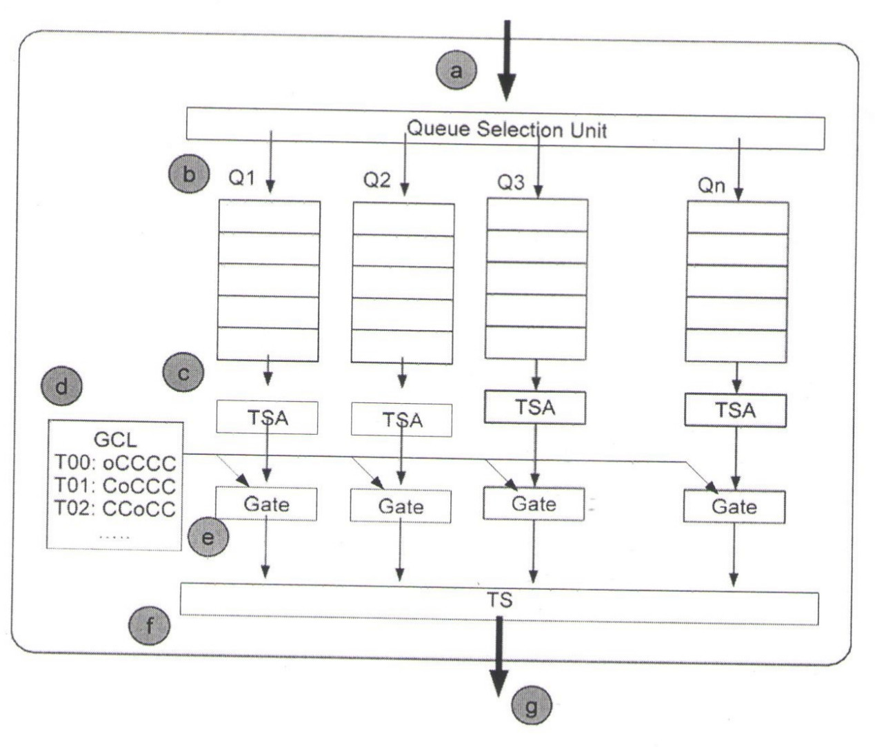 Вводимые данные поступают и помещаются в исходящий порт. Данные проходят через блок выбора очереди (a) и помещаются в нужную очередь (b). Алгоритм выбора передачи (TSA) выбирает (c), какие данные взять из очереди, и если следующий шлюз Gate (e) открыт, то они могут быть переданы. Открытые шлюзы определяются списком управления щлюзами (d). Выбор передачи TS (f) выбирает, какие данные должны быть переданы с выхода данных (g). Как показано на рис. 2, существует несколько очередей для обслуживания различных классов трафика. Таким образом, всего существует максимум 8 очередей, по одной для каждого класса трафика. Если очередей меньше восьми, каждая очередь может содержать данные от нескольких типов классов трафика. TSA решает, в каком порядке будут передаваться данные из очереди. Даже если TSA выбрала некоторые данные для дальнейшей передачи, шлюзы, следующие за ними, могут заблокировать передачу. Благодаря этому можно отдать приоритет не самому приоритетному типу трафика, а неким другим данным. Шлюзы являются краеугольным камнем TSN. Каждый шлюз может находиться в открытом или закрытом состоянии. Управление ими осуществляется с помощью списка управления шлюзами. Операции в списке управления шлюзами заключаются в открытии или закрытии определенных шлюзов. Селектор передачи принимает кадр с наивысшим приоритетом, который может быть выбран для передачи [6]. Если шлюз перед селектором передачи закрыт, то он будет действовать так, как будто данные для передачи отсутствуют.