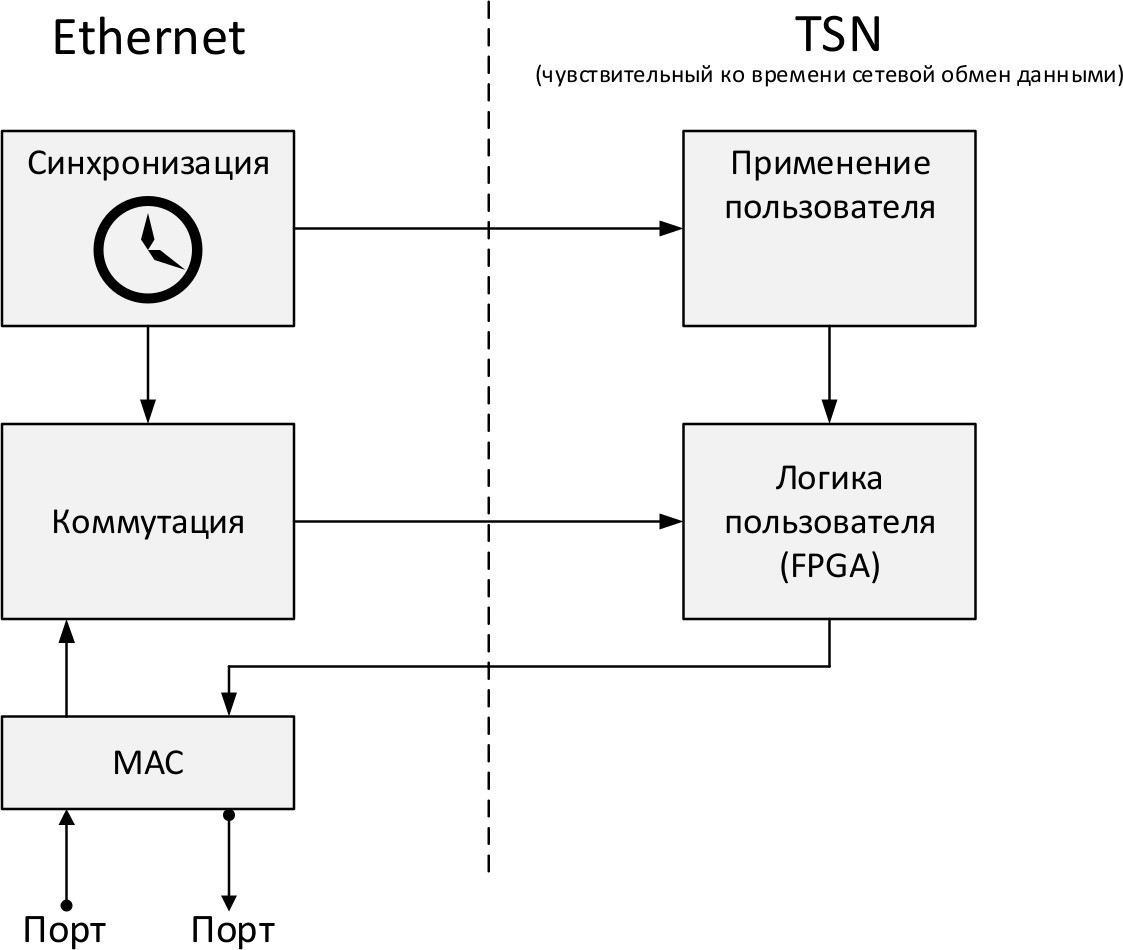 Объединение данных требует, чтобы все данные либо были одинакового времени, либо имели известный момент появления. Это также требует точной синхронизации времени между всеми устройствами сбора данных. Большинство распределенных систем, критичных ко времени, нуждаются в той или иной форме синхронизации времени. Синхронизация позволяет детерминировать возникающие задержки. Появилось множество протоколов различных производителей, направленных на обеспечение гарантированных сетевых задержек. Это привело к невозможности совместной работы оборудования различных производителей или к неоправданно большим затратам на приобретение специальных шлюзов, обеспечивающих такую совместную работу. Ситуация изменилась с появлением сетей с управляемыми задержками (Tim-Sensitive Nets – сети, чувствительные к задержкам), которые все более активно начинают внедряться в промышленную автоматизацию. Эти сети, совместимые с Ethernet, способны передавать высокоприоритетные пакеты с минимально возможными задержками. Они совместили в себе все положительные свойства сетей Ethernet с возможностью получения детерминированной задержки сетей TDM, предоставляя абсолютный приоритет пакетам, наиболее чувствительным к задержкам. Появился ряд стандартов, дополняющих существующие стандарты Ethernet, в которых предусматривается получение детерминированных задержек в сетях Ethernet за счет жесткой синхронизации по времени и управления потоками трафика на основе расписания. Переключение потоков в TSN осуществляется за счет введения в коммутаторы Ethernet дополнительных аппаратных средств в виде программируемых логических матриц (ПЛМ). Необходимость получения детерминированных задержек привела также к созданию подобных беспроводных сетей.