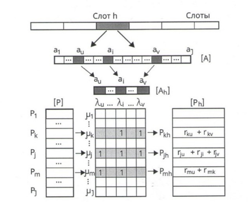 Процесс передачи является циклическим, весь цикл разделяется на временные слоты, в течение каждого из которых может передаваться трафик только одного класса (рис. 6). Если в соответствии с технологическим процессом в течение данного слота должна производиться передача трафика класса , то в сети из всего запланированного множества соединений выделяется подмножество соединений , обеспечивающих одновременную передачу указанного трафика. Это подмножество характеризуется матрицей, столбцы которой соответствуют соединениям, а каждая строка соответствует одному из выходных портов коммутаторов сети. Каждый порт характеризуется интенсивностью , с которой может обрабатываться проходящий через него трафик. Столбцы матрицы соединений содержат единицы в клетках тех портов, которые задействованы в данном соединении, а единицы в строках матрицы свидетельствуют о том, что соответствующие выходы класса должны быть открыты в течение всего рассматриваемого слота времени. Одновременно определяется загрузка каждого выхода трафиком соединения . Суммируя загрузку от всех соединений, трафик которых проходит через рассматриваемый выход, получим суммарную загрузку данного выходного порта, как это показано на рис. 6.