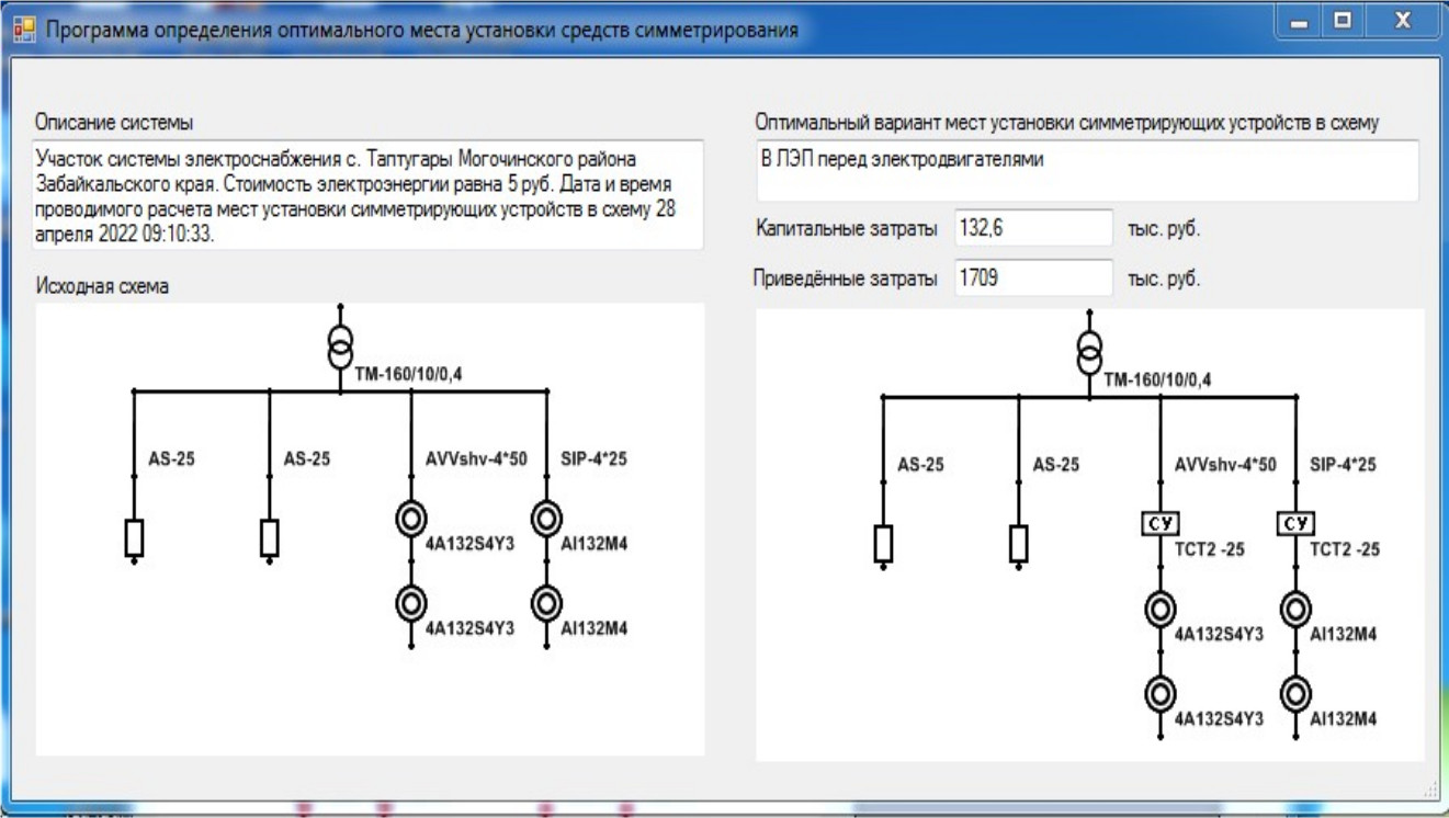 Резюмируя вышеизложенное, отметим следующее: прикладная программа как инструмент разработанного метода позволяет выполнить автоматический расчет места размещения и выбор средств симметрирования в ЭТК предприятий. Кроме того, она наглядно демонстрирует места установки СС в проектируемой схеме ЭТК и отображает технико-экономическую информацию комплекса технических мероприятий, ориентированных на обеспечение эффективного функционирования ЭТК с наличием электродвигательной нагрузки, путем нормализации уровня несимметрии питающего напряжения.