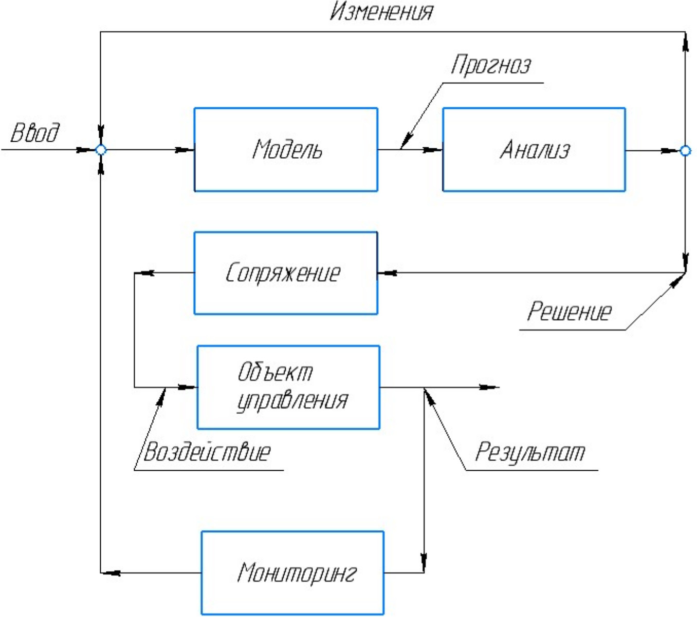 На рис. 1 представлена обобщенная схема применения модели в виде цифрового двойника в системе управления. В быстродействующую цифровую модель, отражающую ситуацию объекта моделирования, вводятся исходные управляющие данные. Полученные результаты моделирования анализируются, изменяются и вновь поступают на вход модели. Таким образом осуществляется активное прогнозирование и получение оптимального решения, которое через средства сопряжения формирует управляющие воздействия, поступающие на объект управления с цифрового двойника в системе управления.