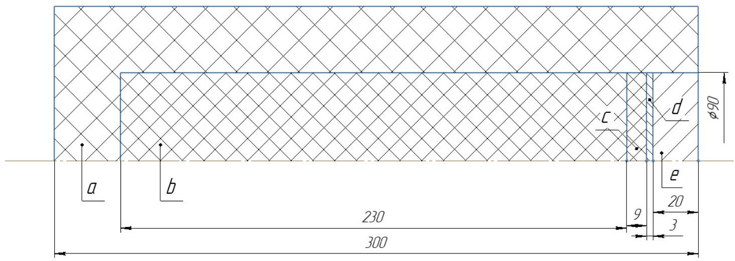 Рис. 2. Схема компоновки, моделирующая конструкцию сейфа либо защитного контейнера: a – теплоизоляционный материал; b – защищаемый объект; c – образец теплозащитного покрытия; d – имитация внутренней металлической оболочки сейфа; e – имитация внешней металлической оболочки сейфа