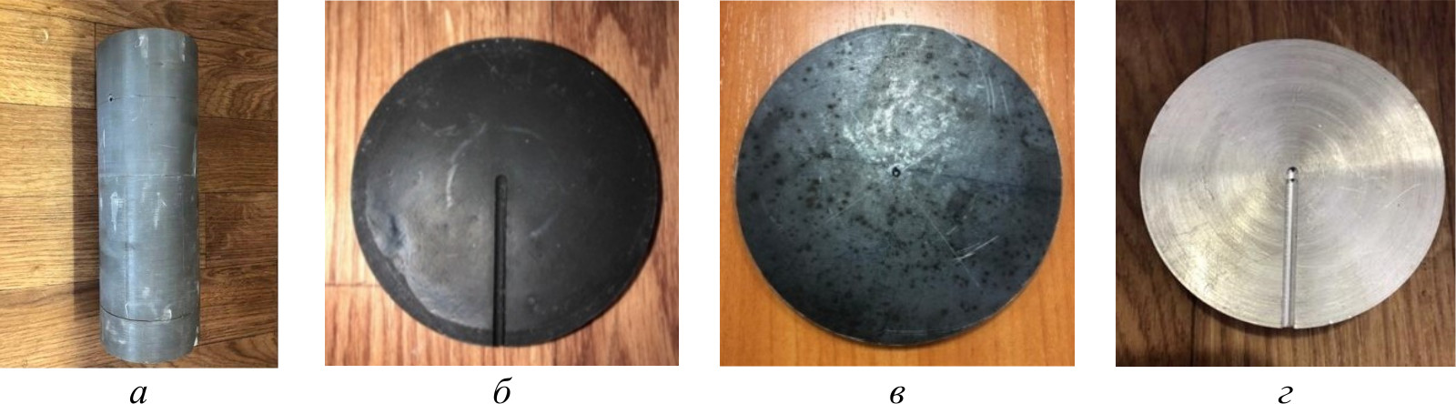 Рис. 3. Элементы макета: а – защищаемый объект; б – образец теплозащитного покрытия; в – имитация внутренней металлической оболочки; г – имитация наружной металлической оболочки