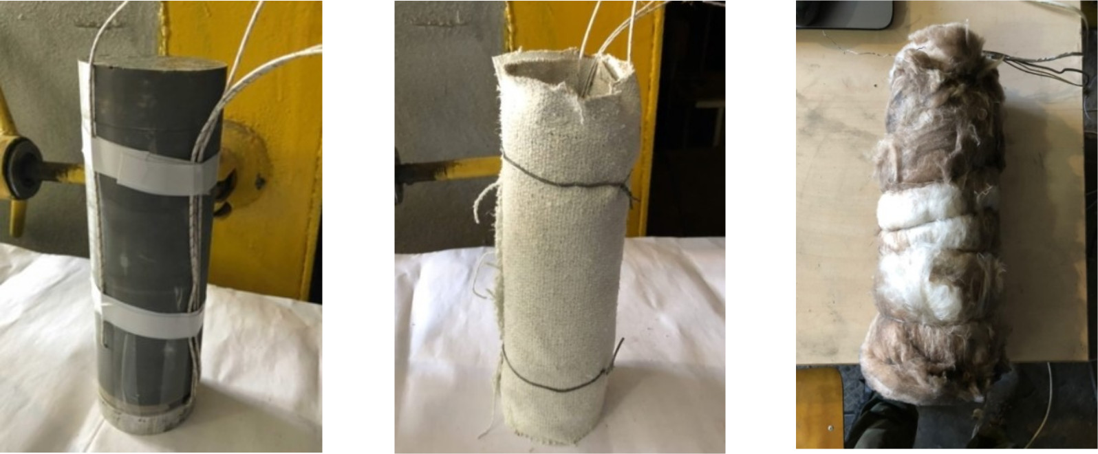 Были проведены эксперименты с целью определить, сколько времени требуется для того, чтобы температура в зоне между защищаемым объектом b и образцом теплозащитного материала c достигла температуры 180 °С при воздействии на внешнюю оболочку «e» пламени горелки. При этом температура на нагретой поверхности поддерживалась в диапазоне (800…1000) °С. Таким образом, в постановке эксперимента рассматривается одна из многочисленных задач, связанных с разработкой теплозащитных материалов.