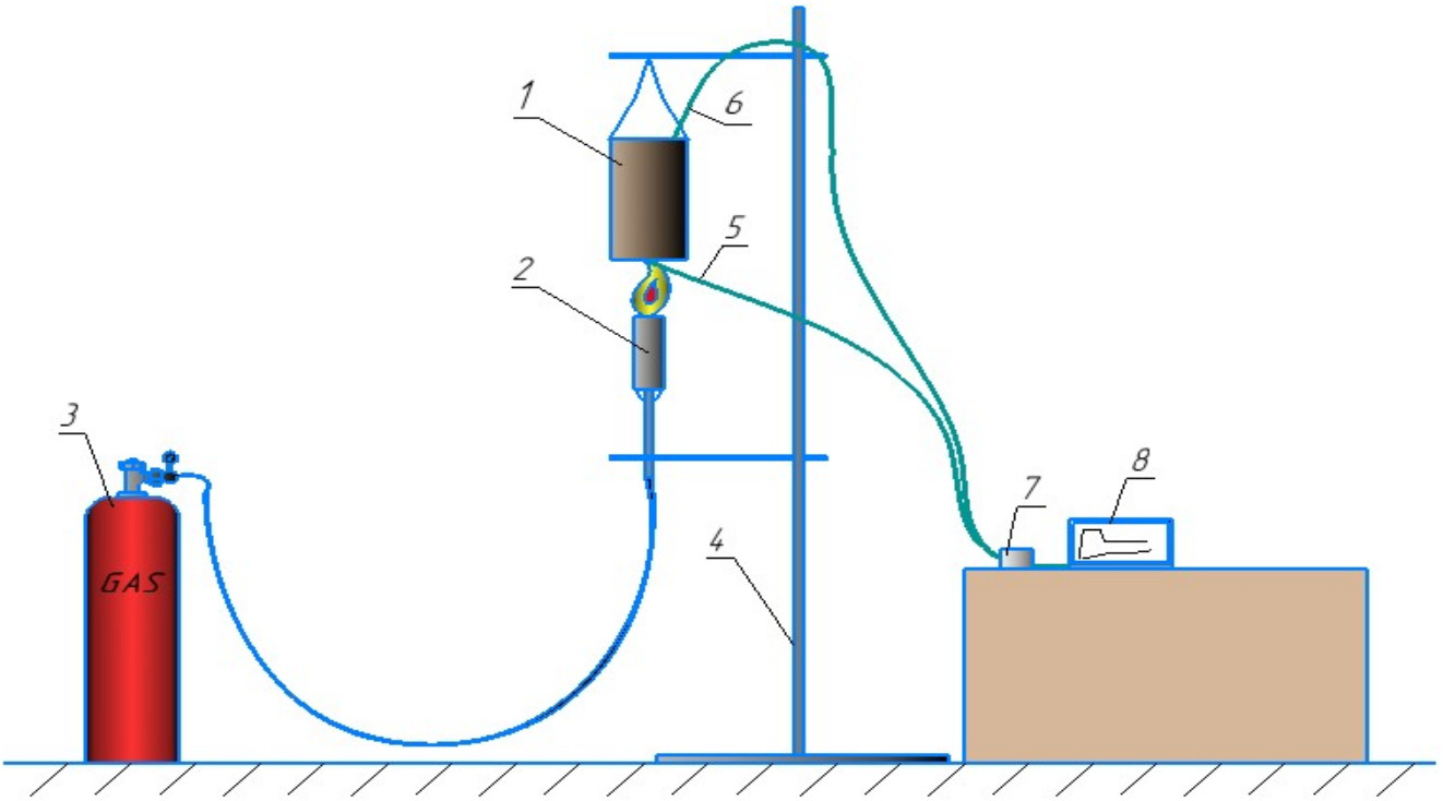 Рис. 5. Схема проведения эксперимента на испытательном стенде: 1 – макет; 2 – газовая горелка; 3 – газовый баллон; 4 – штатив; 5 – термопара; 6 – термопара; 7 – аналого-цифровой преобразователь; 8 – компьютер