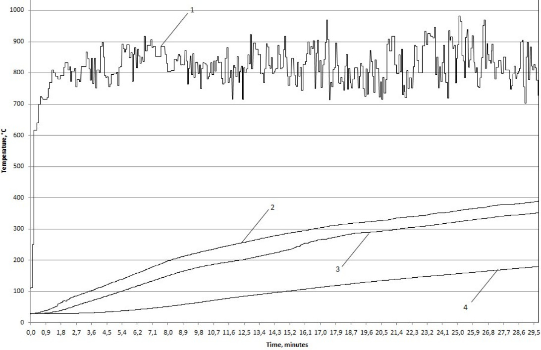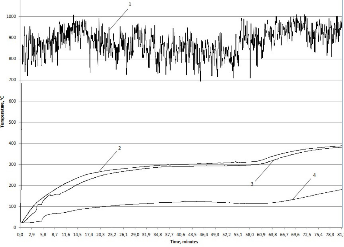 Рис. 8. График изменения температур в макете с образцом № 3: 1 – температура в зоне нагрева; 2 – температура между внешней и внутренней оболочками; 3 – температура между внутренней оболочкой и образцом ТЗП; 4 – температура между образцом ТЗП и защищаемым объектом