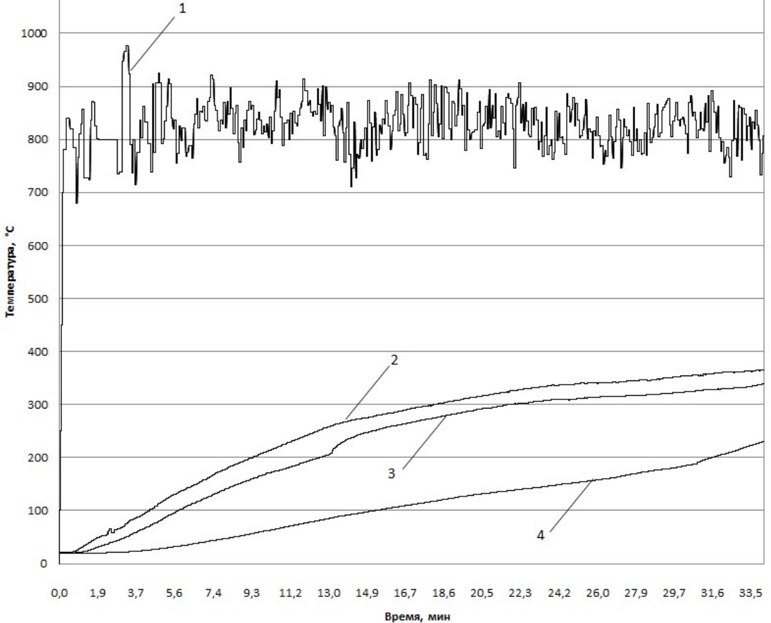 Рис. 7. График изменения температур в макете с образцом № 2: 1 – температура в зоне нагрева; 2 – температура между внешней и внутренней оболочками; 3 – температура между внутренней оболочкой и образцом ТЗП; 4 – температура между образцом ТЗП и защищаемым объектом