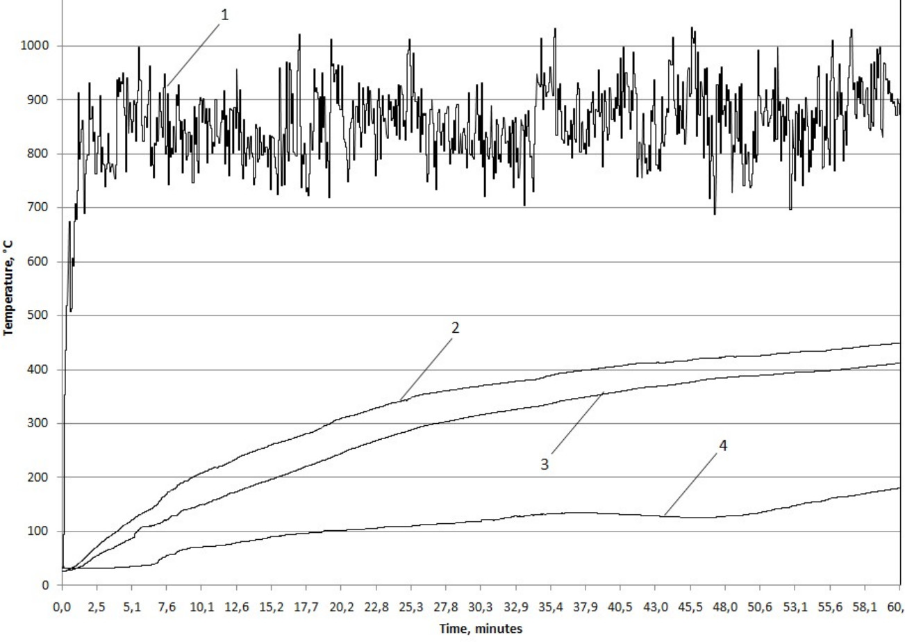 Рис. 6. График изменения температур в макете с образцом № 1: 1 – температура в зоне нагрева; 2 – температура между внешней и внутренней оболочками; 3 – температура между внутренней оболочкой и образцом ТЗП; 4 – температура между образцом ТЗП и защищаемым объектом