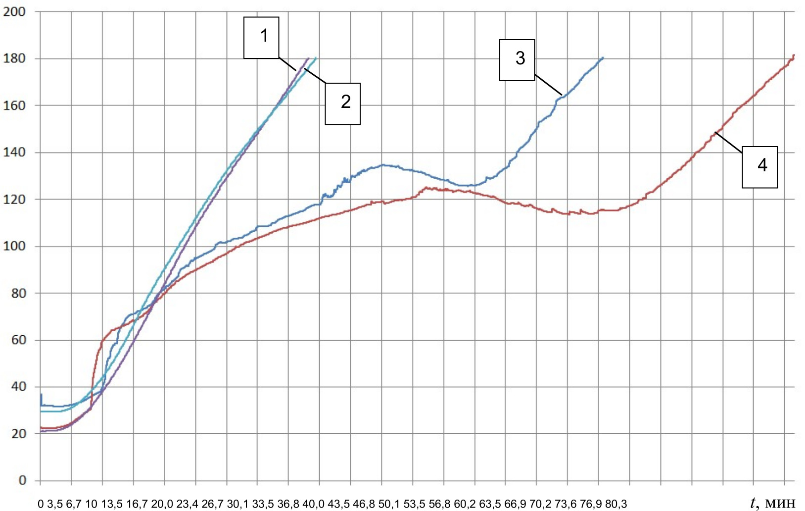 Из графиков, показанных на рис. 10, видно, что образец № 1, который не содержит эндотермического компонента, показал самое короткое время экспозиции. Не дало особого прироста по времени прогрева и внедрение в образец № 2 высокопористого наполнителя. Следует отметить, что во время экспериментов с образцами № 1 и № 2 температура на границе ТЗП – защищаемый объект росла линейно. Самое длительное время нагрева до температуры 180 °C между защищаемым объектом и образцом TЗП наблюдается в эксперименте с образцом № 4, поскольку рецептура содержит наибольшее количество эндотермического наполнителя.