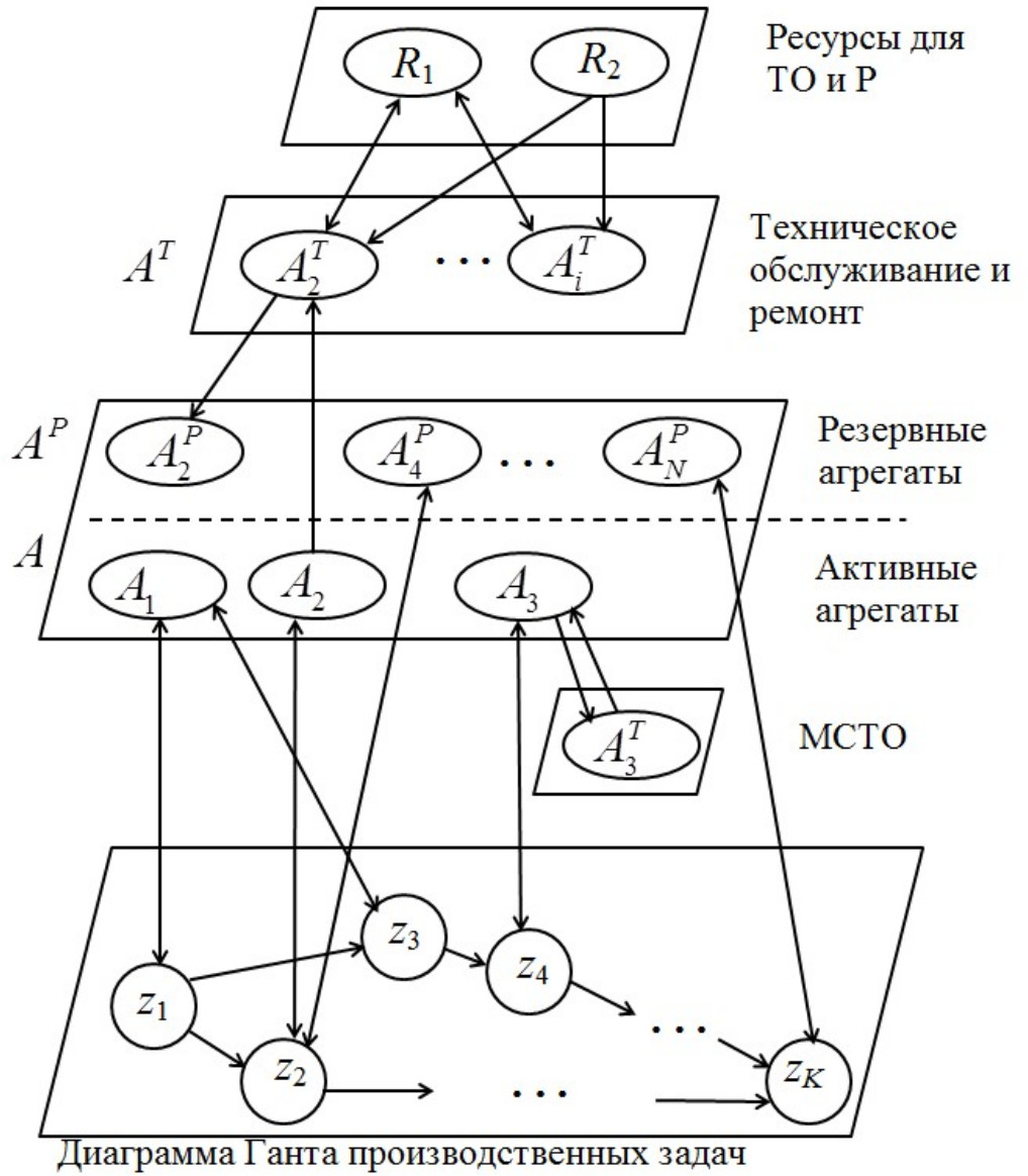 Множество всех агрегатов технического объекта обозначим как . При этом – подмножество активных агрегатов, работающих в данный момент; – подмножество агрегатов, находящихся в состоянии ТО или ремонта; – подмножество резервных агрегатов, которые могут быть использованы в эксплуатации: . Производственные задачи выполняются в соответствии с диаграммой Ганта процесса эксплуатации. Для выполнения ТОиР используются повторно используемые ресурсы R1 и расходные ресурсы R2.