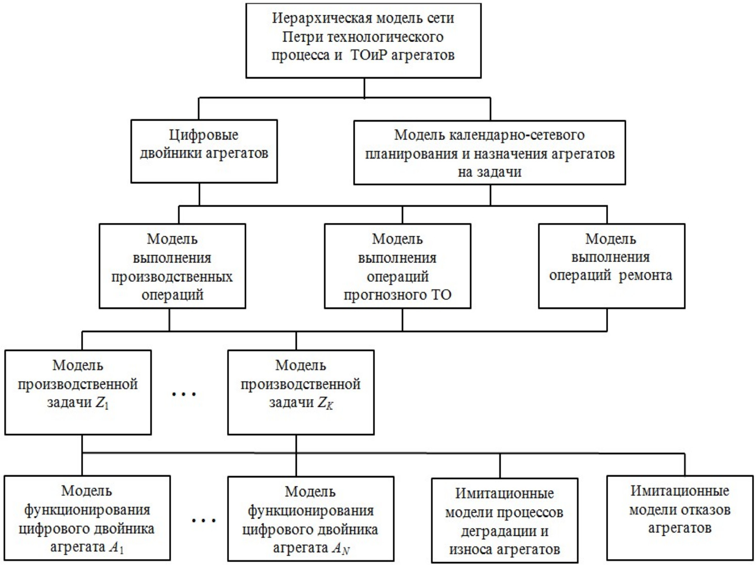 Для многих приложений вид иерархической сети Петри для моделирования ТОиР имеет общую структуру, которая показана на рис. 3. На верхнем уровне находятся модели агрегатов или объектов в виде «цифровых двойников», которые описывают внутреннюю динамику функционирования. На этом же уровне реализуется модуль, связывающий график производственного или технологического процесса с назначением конкретных агрегатов определенным задачам в заданные периоды времени. На этом этапе могут использоваться методы дискретной оптимизации для решения задачи о назначениях. Пример использования оптимизационно-имитационного подхода для решения аналогичной проблемы приведен в работе [22]. В результате получаем распределение активных агрегатов по задачам и формирование множества резервных агрегатов.