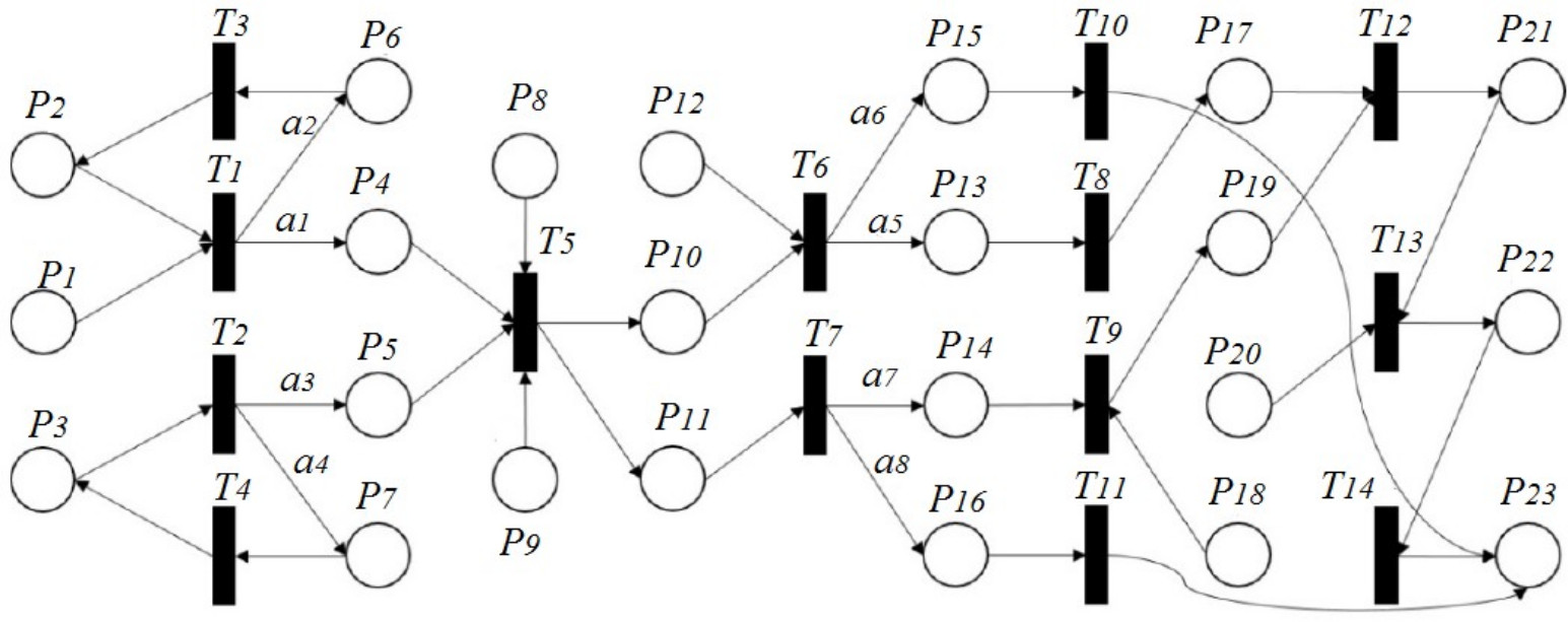 Позиции в сети содержат цветные фишки, определяющие условия срабатывания переходов. Позиция P1 соответствует производственной задаче, а позиция P2 – исполнителю работы. Позиции P3, P5 и P7 определяют вид и количество материала. Позиции P4 описывает готовность исполнителя работ, а P6 – отсутствие исполнителя. Состояние БП задается фишками в позициях P8 и P9. Набор позиций P10–P16 служит для задания условий по выполнению производственной задачи и логистических операций. Позиции P17–P22 определяют условия по транспортировке груза к выбранной точке назначения. Завершение операций и начало следующего цикла представляются позицией P23. Дугам a1–a8 назначаются выражения типа условного оператора для задания логики работы моделируемой системы.