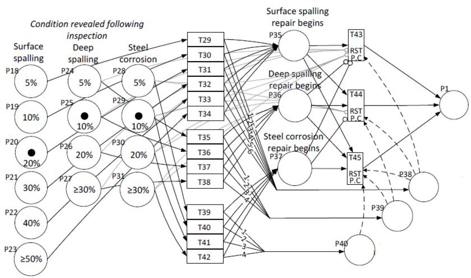 В работах Andrews J., Le B. и др. предложен ряд моделей на базе стохастических временных сетей Петри [30–33]. Модель моста имеет иерархический характер и формируется из подмоделей каждого из компонентов моста. При этом учитывается как износ отдельных компонентов, так и зависимость между процессами износа взаимодействующих компонентов. Время между состояниями в результате ухудшения параметров и проведением технического обслуживания регулируется соответствующими распределениями Вейбулла. Модель сети Петри учитывает процессы деградации, инспекции и ремонта отдельных элементов моста при исследовании альтернативных стратегий обслуживания.