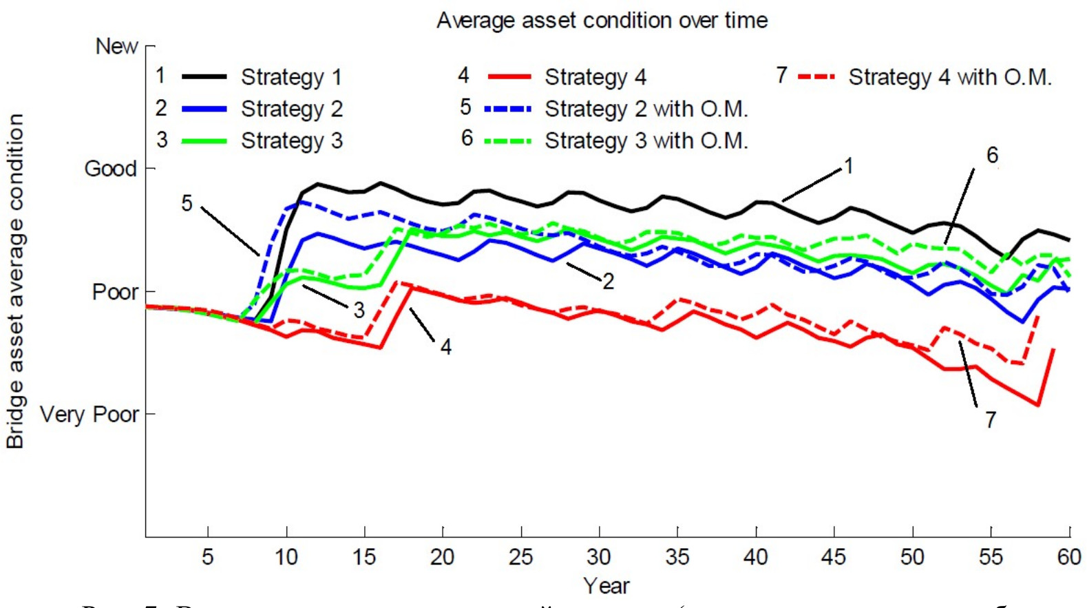 Рис. 7. Влияние различных стратегий ремонта (с оппортунистическим обслуживанием (O.M.) или без него) на состояние элементов моста в среднем [32]