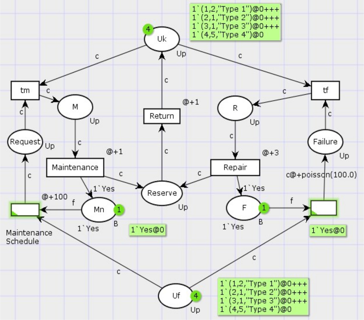 Анализ известных работ в области организации технического обслуживания и ремонта (ТОиР) показал, что в последний период времени все больше исследователей обращаются к моделям на сетях Петри [7–9]. Используются различные модификации сетей Петри, при этом наиболее эффективными являются временные раскрашенные сети Петри TCPN (Timed Colored Petri Nets) [10] .