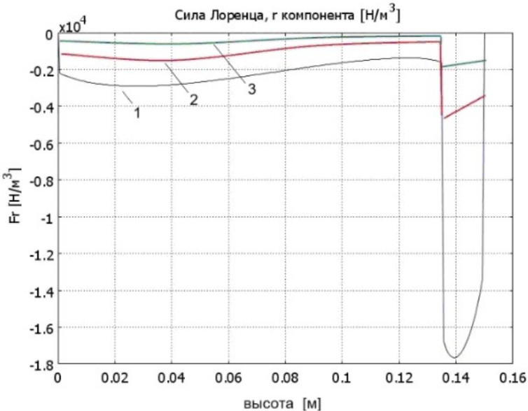 Рис. 3. Диаграммы распределения r-компоненты силы Лоренца вдоль оси z для расплава высотой 0,015 м: 1 – r = 0,15 м; 2 – r = 0,12 м; 3 – r = 0,1 м