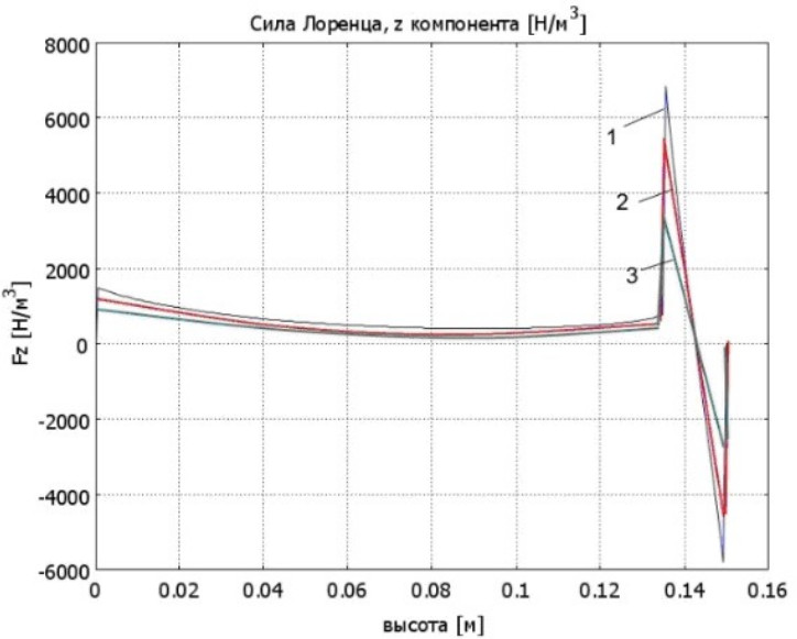 Рис. 4. Диаграммы распределения z компоненты силы Лоренца по высоте слитка высотой 0,15 м: 1 – r = 0,15 м; 2 – r = 0,12 м; 3 – r = 0,1 м