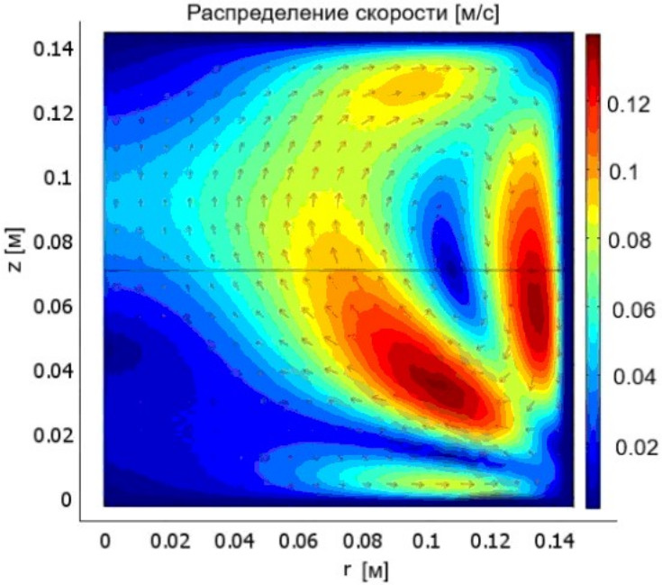 Рис. 7. Распределение скорости в расплаве кремния высотой 0,15 м