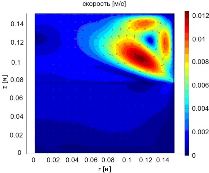 Рис. 9. Распределение поля скоростей в расплаве кремния высотой 0,015 м