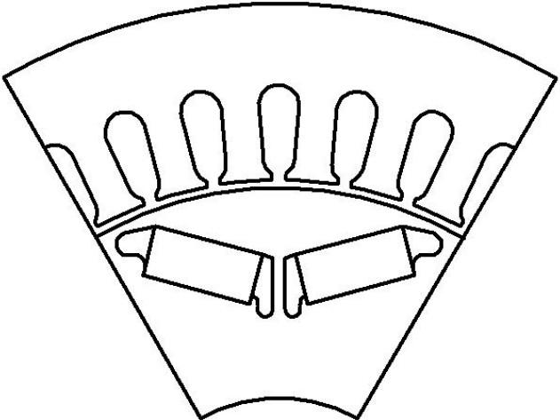 – максимальная индукция в зазоре зависит от способа размещения ПМ в индукторе, для IPM машин с V-образной конфигурацией магнитов 0,5…0,7 Тл. Большие значения соответствуют большим объему и магнитной энергии ПМ;