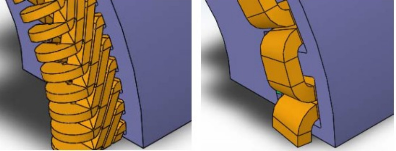 Для преодоления указанных недостатков применяются концентрические сосредоточенные обмотки [11], в том числе и в тяговых двигателях [12]. На рис. 5 показан фрагмент якоря с распределенной и сосредоточенной обмотками.