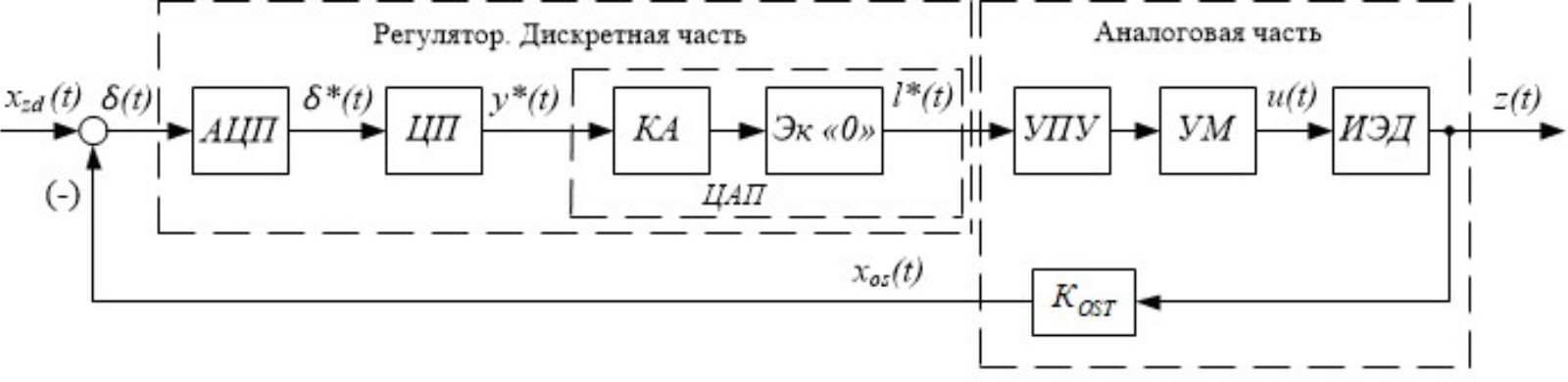 Рис. 1. Функциональная схема цифровой САУ: АЦП – аналогово-цифровой преобразователь; ЦП – центральный процессор; ЦАП – цифро-аналоговый преобразователь; КА – кодово-аналоговый преобразователь; Эк «0» - экстраполятор нулевого порядка; УПУ – усилительно-преобразовательное устройство; УМ – усилитель мощности; ИЭД – исполнительный электродвигатель; Kos – датчик обратной связи; xzd(t) – аналоговый сигнал задания; δ(t) – аналоговый сигнал ошибки; δ*(t) – дискретный сигнал; y*(t) – дискретный сигнал; l*(t) – дискретный сигнал; u(t) – аналоговый сигнал; z(t) – аналоговый сигнал на выходе системы; xos(t) – аналоговый сигнал обратной связи.