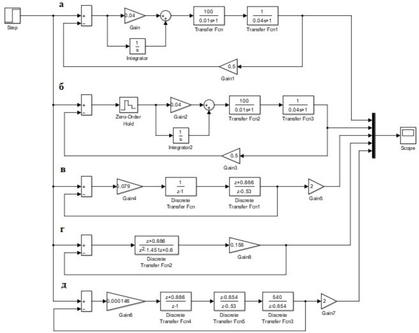 Исследование проводится методом компьютерного моделирования в среде Matlab [8 – 10]. В этой связи целесообразно отметить, что схема на рис. 2, б, в которой дискретность определяется параметрами экстраполятора нулевого порядка (блок Zero-Order), схема на рис. 2, в, в которой желаемая разомкнутая система представлена в форме Z-преобразования, и схема на рис. 2, г, в которой регулятор и аналоговая часть системы представлены в форме Z-преобразования дают одинаковый отклик системы на единичное скачкообразное входное воздействие.