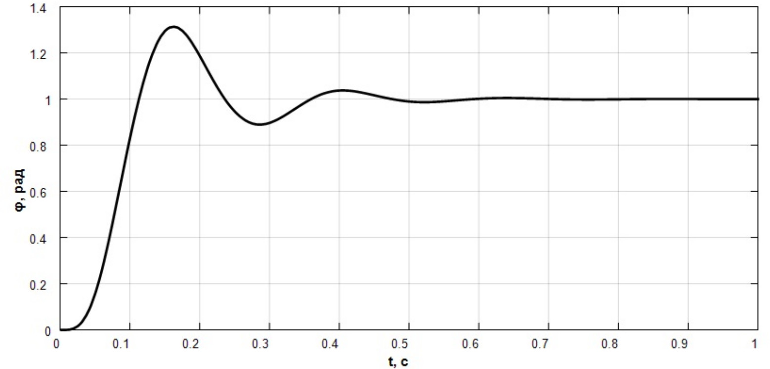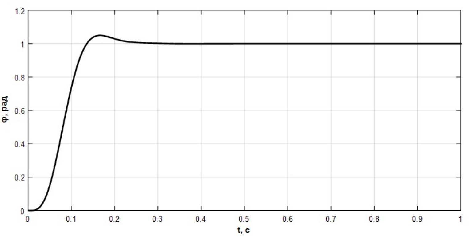 Рис. 9. Переходный процесс цифровой САУ для значений периодов дискретности контуров тока, скорости и положения T0I = 0,025 с, T0V = 0,014 с, T0P = 0,00628 с.