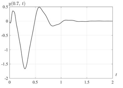 The diagram of the transition process presented in Fig. 1 demonstrates that the disturbance effect is compensated with error that does not exceed 3%. The control activities applied at the elastic object’s right boundary are active for 1.5 sec and do not exceed the module’s allowable values.