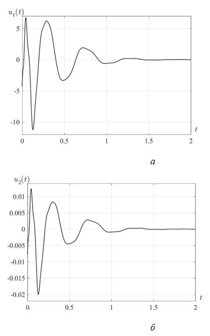Fig. 2. The control actions. а: moment u1(t) at the object’s right boundary and б: time derivative u2(t) = ∂u1(t)/∂t at the object’s right boundary
