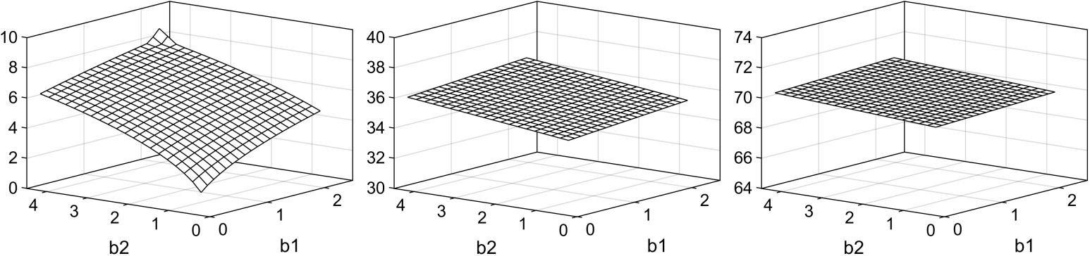 Рис. 3. Зависимости первых трёх корней уравнения (6) от b1, b2