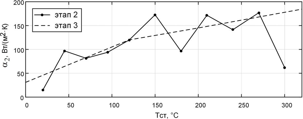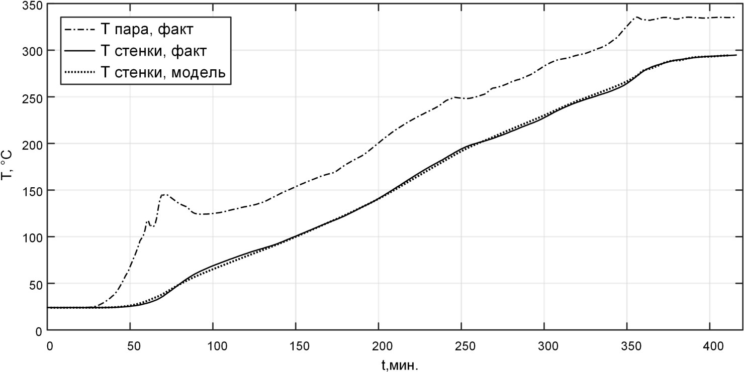 - линейная зависимость для коэффициента теплопередачи на внутренней стороне стенки не обеспечивает требуемого качества поведения модели: на первом временном интервале процесса растопки, до достижения температуры металла 150 °C, модельная температура превышает фактическую, на втором интервале – отстаёт;