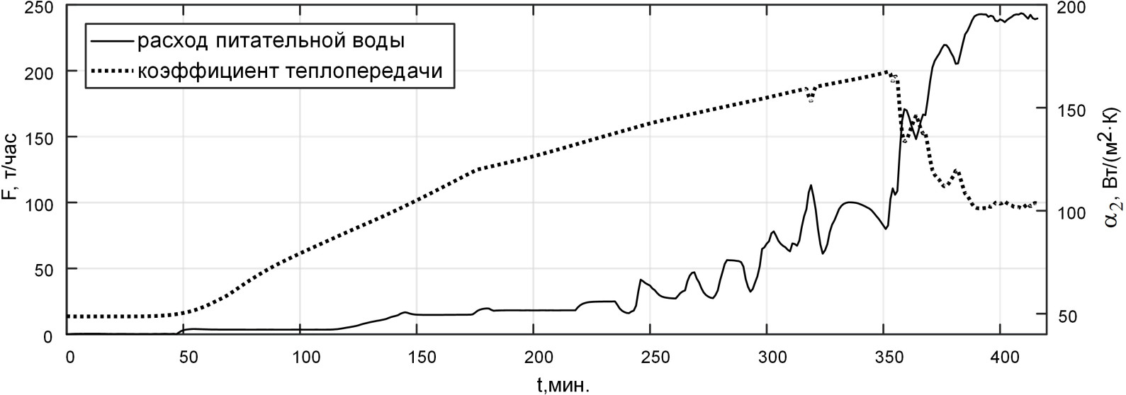 Рис. 7. Изменение расхода питательной воды и коэффициента теплопередачи в процессе моделирования