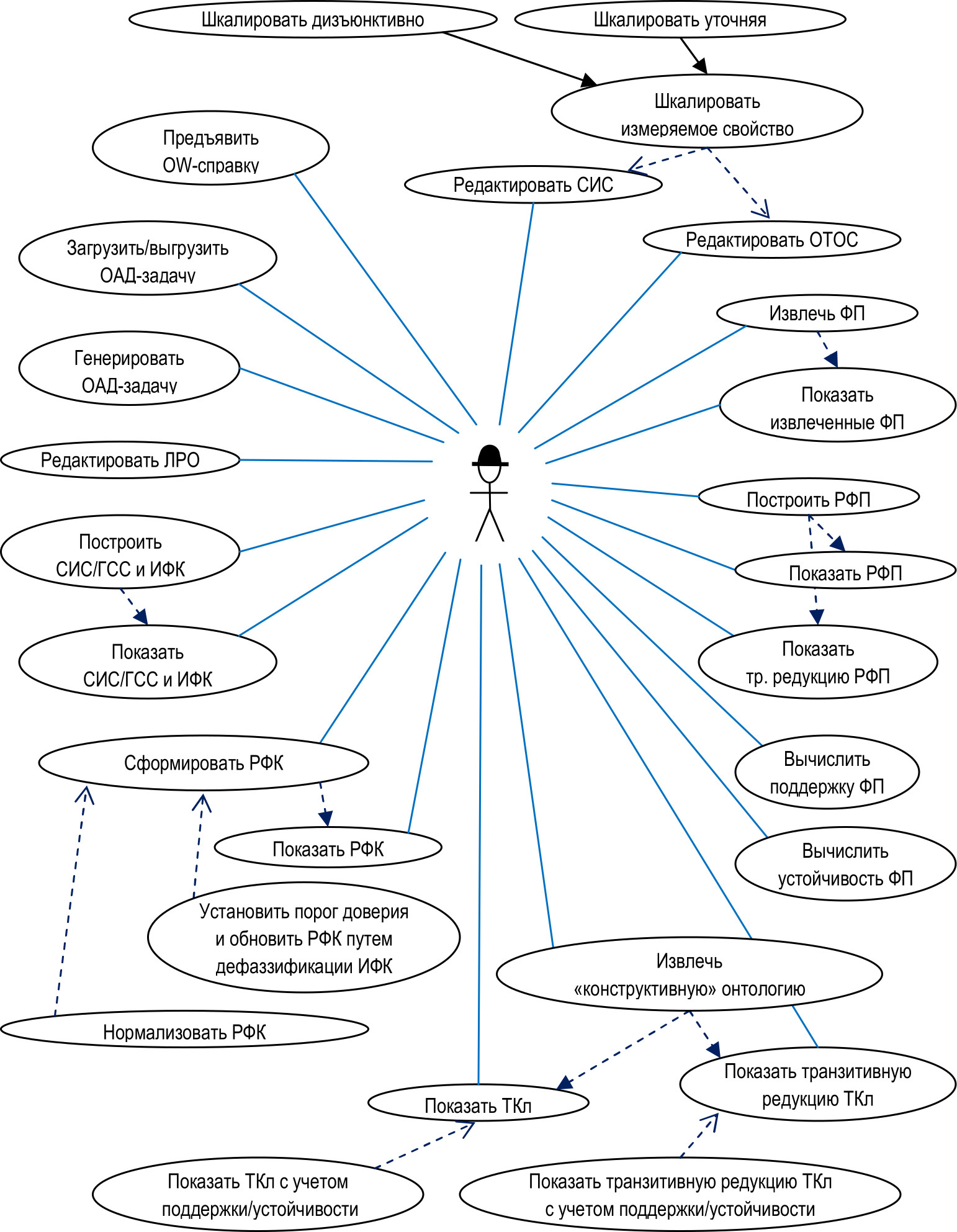 Рис. 2. Диаграмма вариантов использования программной лаборатории для онтологического анализа данных OntoWorker: ▬ коммуникация; ➜ обобщение; - - -► включение (include); - - -⋗ расширение (extend)