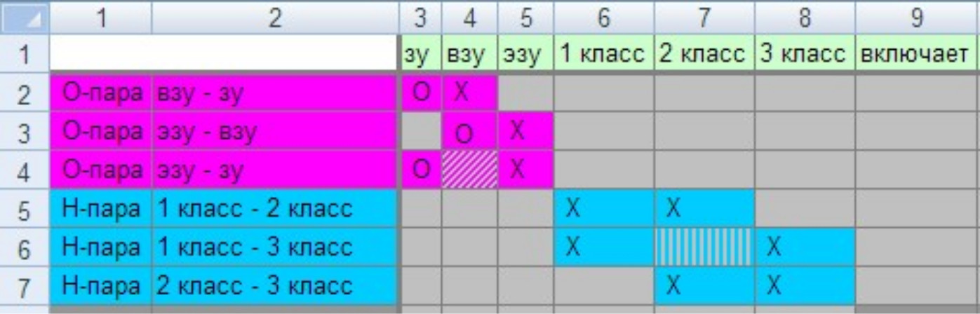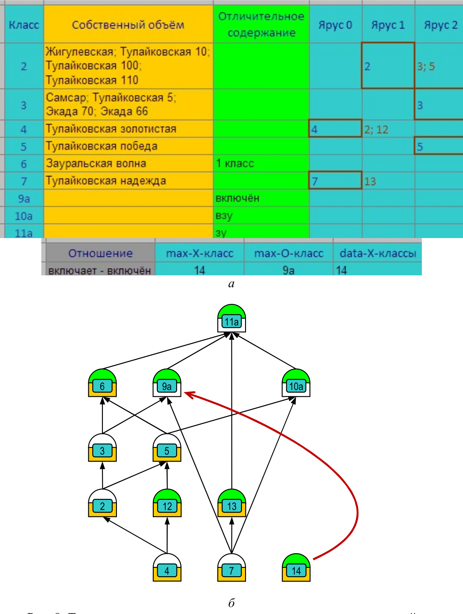 На рис. 4 дан фрагмент скриншота листа СИС, где отражены состав и сопряженность учитываемых характеристик сортов пшеницы. О-пары свойств отмечают естественные отношения обусловленности между данными в [28] оценками засухоустойчивости сортов: если сорт «высоко засухоустойчив» (взу), то он и «засухоустойчив» (зу); если он «экстремально засухоустойчив» (эзу), то он и «высоко засухоустойчив», и «засухоустойчив». Н-пары закрепляют установленное ГОСТ [30] разделение пшеницы мягких сортов на пять непересекающихся классов. Представленные в [28] сорта характеризуются в рамках 1–3-го классов, и в СИС фиксируется их несовместимость. Наконец, В‑пара описывает сопряженные, или «встречные» валентности объектов (в ОАД валентности описывают потенциальные способности объектов ПрО вступать в связи, реализующие различные несимметричные бинарные отношения): сорт может быть «включен» в Госреестр, а по отношению к некоторому сорту состояние Госреестра может характеризоваться тем, что он «включает» этот сорт.