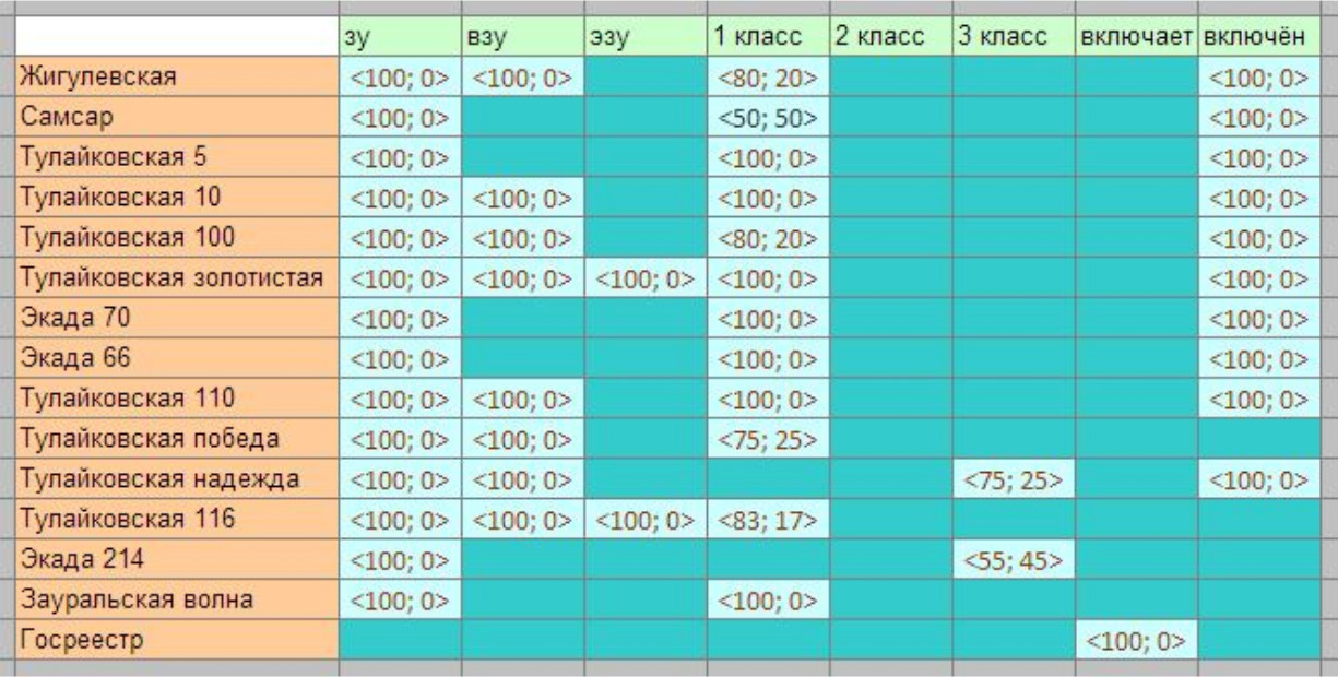 Рис. 6 демонстрирует фрагмент скриншота листа «Верстак» со сформированным и нормализованным РФК: все непустые элементы соответствия «объекты – свойства» отвечают БСС, принятым как однозначно истинные (True), а пустые указывают БСС, признанные ложными (False). При формировании этого РФК специального порогового сечения ИФК не проводилось; РФК сформирован из ИФК лишь путем исключения заведомо ложных БСС [22]. Нормализация в данном случае свелась к устранению исходной двусмысленности в определении классности сортов мягкой пшеницы.